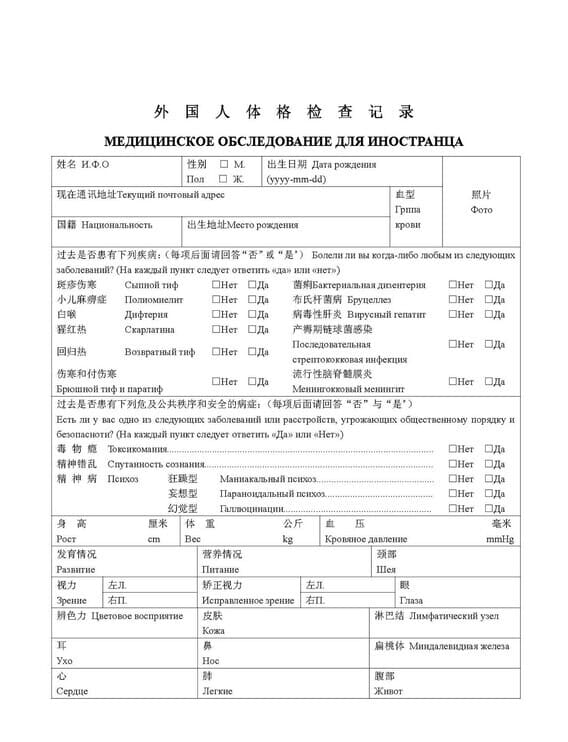 Наличие справки о здоровье для выезда в Китай по форме Foreigner Physical Examination Form, утвержденной китайским правительством, подтверждает отсутствие заболеваний, которые представляют угрозу обществу. Оформление документа выполняется на английском языке, а основные сведения дублируются на китайском. При этом получить справку для поездки в Китай можно далеко не в каждом медицинском учреждении, а только в том, которое имеет соответствующее разрешение на выдачу бланков указанного образца.